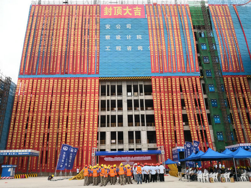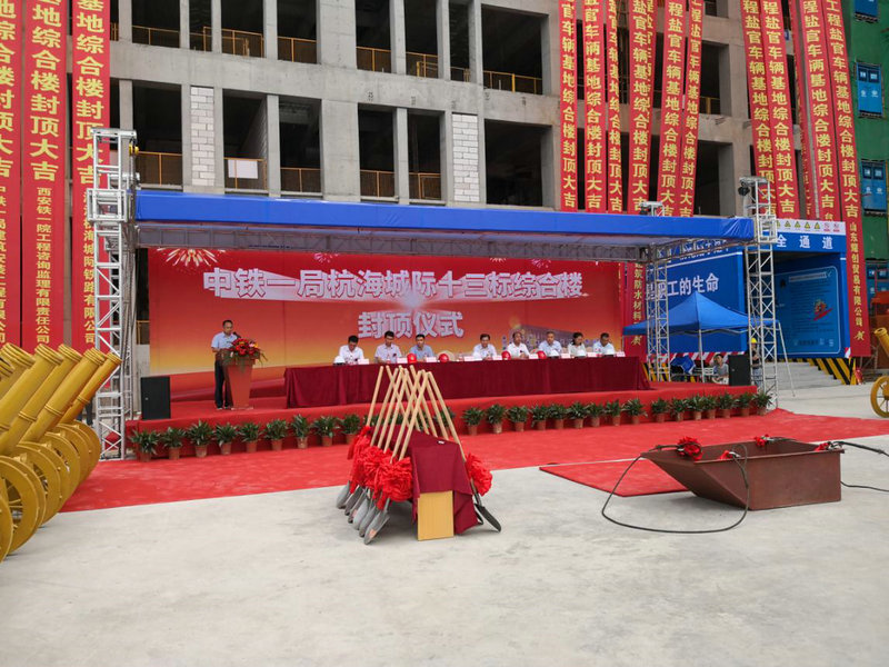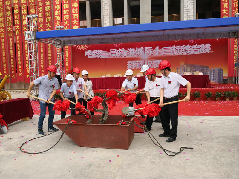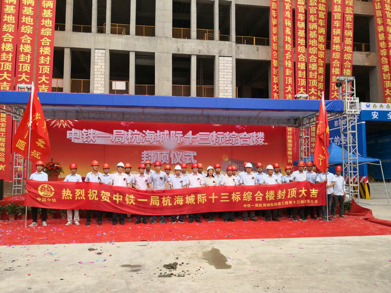 (海寧訊)6月10日,中鐵一局杭海城際鐵路鹽官車輛基地最大單體工程——綜合樓順利實(shí)現(xiàn)主體封頂。 浙江省交投集團(tuán)軌道部副總經(jīng)理陳明、杭海城鐵公司總經(jīng)理言建標(biāo)、海寧市杭海城鐵指揮部副總指揮湯治安、杭海城鐵公司副總經(jīng)理鄧建林、中鐵(上海)投資有限公司杭海城際項(xiàng)目部項(xiàng)目經(jīng)理張艷文、中鐵一局建安公司工會(huì)主席王淑娟以及來自監(jiān)理、設(shè)計(jì)單位的領(lǐng)導(dǎo)和嘉賓出席封頂儀式。項(xiàng)目部職工和勞務(wù)工代表共100余人參加。