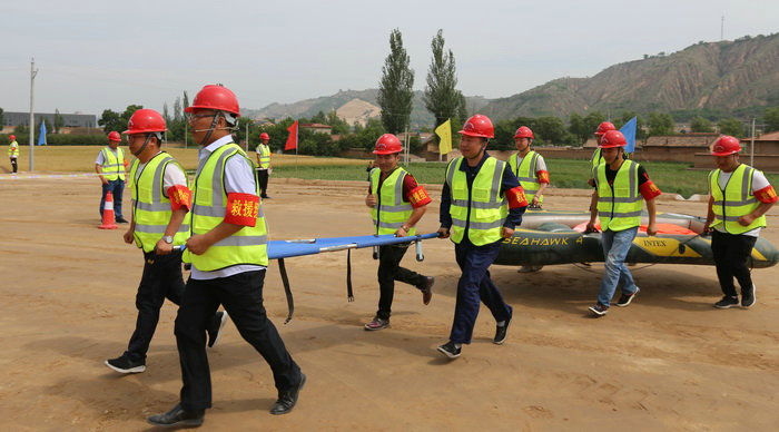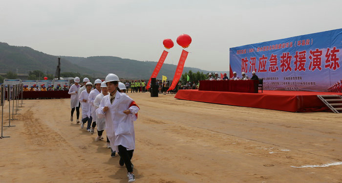 各演練小組奔赴崗位 防汛演練總指揮由甜永高速環(huán)縣段項目辦副主任趙金海擔(dān)任,副總指揮由中鐵二十一局三公司甜永高速9標(biāo)副經(jīng)理白永喜擔(dān)任。直接參與演練的人員達(dá)到70多人,全線13個土建標(biāo)段、6個監(jiān)理標(biāo)段、2個試驗標(biāo)、2個控制標(biāo)、7個路面標(biāo)共30個標(biāo)段的安全負(fù)責(zé)人、項目負(fù)責(zé)人到現(xiàn)場觀摩,附近群眾在劃定區(qū)域外觀看,總?cè)藬?shù)達(dá)到360多人。慶城縣應(yīng)急管理局副局長梁建榮應(yīng)邀親臨現(xiàn)場觀摩,慶城縣人民醫(yī)院派出醫(yī)護(hù)人員和120急救車參加演練。