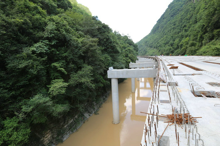 綿延不絕的秦巴山脈深處,西鎮(zhèn)高速公路建設(shè)正如火如荼。如果不到現(xiàn)場,是難以想象該項目的建設(shè)難度。西鄉(xiāng)縣古城鎮(zhèn)是西鎮(zhèn)高速的起點一標段,路線往南順著涇洋河上游就一頭扎進了秦巴山,兩邊是數(shù)百米高的高山,涇洋河順著山勢沿河而下,河床寬的地方只有幾十米,窄的地方僅有十多米。有30多公里為無人區(qū),深山峽谷中除了河流沒有路。為了修建西鎮(zhèn)高速公路,業(yè)主提前兩年順河修建了幾十公里的便道,但其等級很低會車困難,材料運輸極不方便。西鎮(zhèn)高速地處秦巴山腹地,兩山夾一河,兩邊是綿延不絕的高山,沒有一塊平地,且河道很窄,由于地勢獨特,西鎮(zhèn)高速除隧道外,整條線路全部設(shè)計在涇洋河中。