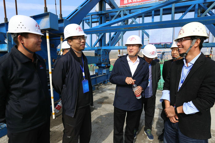 副總經(jīng)理房軍(右二)、副總經(jīng)理兼總工呂劍(左二)與神木店張公路項目部總工鄒森(右工)、副經(jīng)理馬大偉(左一)在橋面愉快交談