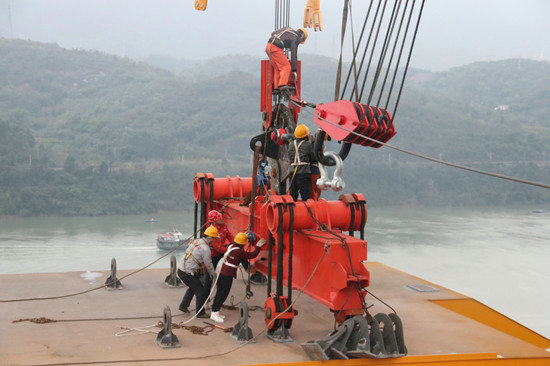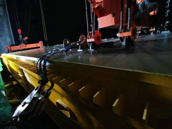 “太洪長(zhǎng)江大橋北岸E類(lèi)端梁段梁長(zhǎng)10.8m,寬39.6米,重193.4t,該梁段設(shè)計(jì)無(wú)永久吊索。該梁段吊裝采用蕩移施工工藝,首先由北岸側(cè)跨纜吊機(jī)垂直起吊E類(lèi)梁段,提升至設(shè)計(jì)橋面高度以上40cm左右的位置后,利用布置于引橋的牽引系統(tǒng)緩慢地將梁段牽引至其安裝位置,最后緩慢下放跨纜吊機(jī)起重索,直至完全卸載,完成端梁段的吊裝作業(yè)。”大橋施工總指揮李忠賢介紹到。