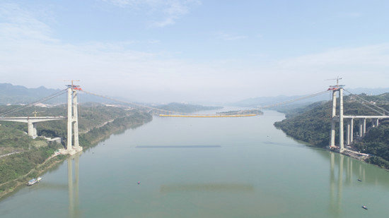 太洪長(zhǎng)江大橋位于重慶市巴南區(qū)和渝北區(qū)的交界處,它是南兩高速的主要控制性工程,也是全線唯一的一座跨長(zhǎng)江大橋,大橋全長(zhǎng)1436米,為主跨808米、設(shè)計(jì)時(shí)速80公里的雙向6車(chē)道鋼箱梁懸索橋。根據(jù)工期計(jì)劃安排,鋼箱梁吊裝工作將于2019年年底吊裝完成,從而實(shí)現(xiàn)大橋的全部合龍。