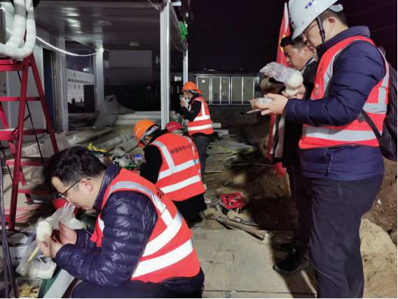 這一次,中鐵一局增援團(tuán)隊(duì)采用專(zhuān)業(yè)分工+區(qū)域分工的方式,管理人員貼身進(jìn)行技術(shù)指導(dǎo),作業(yè)人員們穿插配合,在8個(gè)小時(shí)的時(shí)間里,不僅圓滿完成了自身領(lǐng)受任務(wù),還應(yīng)西安市公共衛(wèi)生中心項(xiàng)目現(xiàn)場(chǎng)指揮部要求緊急抽調(diào)13名參建人員奔赴其它區(qū)域,協(xié)助完成了場(chǎng)地內(nèi)約400多米的動(dòng)力電纜敷設(shè)。