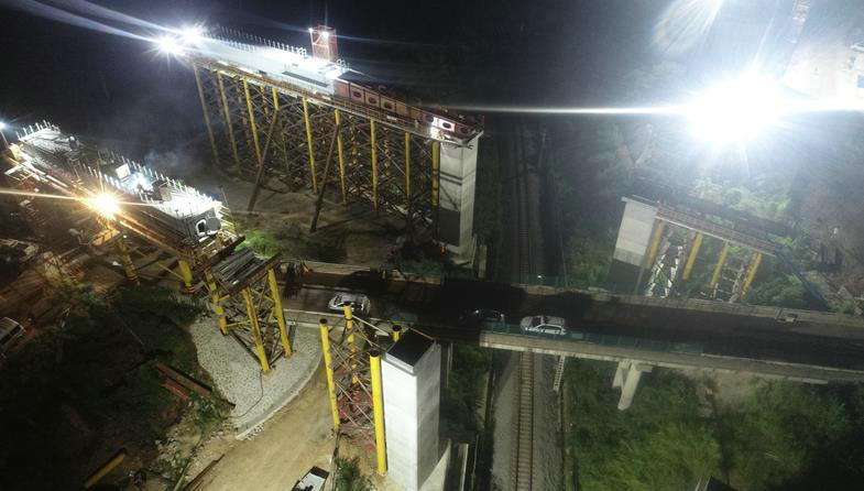 面對困難,福廈鐵路項(xiàng)目部提前準(zhǔn)備、超前謀劃,召開梅山特大橋頂推前交底會(huì)、進(jìn)行同條件模擬試推;前端焊接20米長鋼導(dǎo)梁,導(dǎo)梁和鋼蓋梁連成一個(gè)整體,采用分級(jí)拖拉滑移頂推施工,解決了單跨頂推難題;在鄰近外腹板位置設(shè)置鋼導(dǎo)梁,導(dǎo)梁呈鉛錘方向設(shè)置,保證傳力;拖拉動(dòng)力采用2臺(tái)連續(xù)同步千斤頂,同時(shí)加上電控措施的介入,便于兩側(cè)拖拉的同步控制;為防止拖拉時(shí)兩側(cè)小車的不同步導(dǎo)致橫向偏位,在滑靴上設(shè)置鋼滾輪限位,拖拉過程中發(fā)生較大偏移時(shí),采用單側(cè)控制千斤頂,點(diǎn)動(dòng)拖拉的方式進(jìn)行糾偏,并沿既有鐵路線兩端800米設(shè)置防護(hù)人員及防護(hù)設(shè)施,確保在天窗點(diǎn)期間安全高效完成作業(yè)。