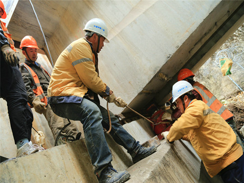 期間,為確保移梁施工安全有序進行,項目部統(tǒng)籌規(guī)劃,科學部署,第一時間指派分管領(lǐng)導深入現(xiàn)場開展調(diào)查,隨后根據(jù)調(diào)查結(jié)果研究制定移梁作業(yè)方案。移梁過程中,工人們嚴格按照前期技術(shù)交底及安全規(guī)定,尋尋有序地開展線路拆除,蓋板支座切割,滑道安放及移梁線路恢復等作業(yè)環(huán)節(jié)。并且在搶抓施工進度的同時,緊抓安全質(zhì)量不放松,嚴格落實施工有方案,技術(shù)有交底,工序有檢查,安全有卡控的工作方針,最終在20余名人員7天的不懈努力下,全線移梁施工完美告捷,為該條鐵路石子壩至中嘴段的按期開通運營提供了堅實保障。