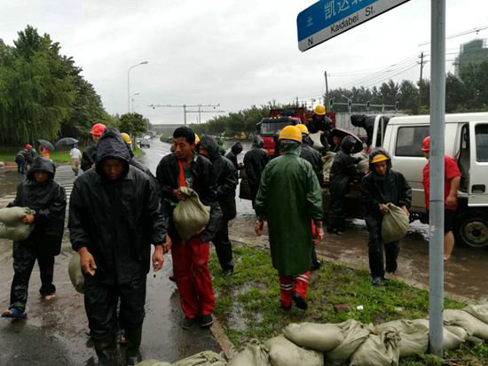 由于中鐵十四局集團(tuán)承建的長(zhǎng)春地鐵2號(hào)線西延線汽車(chē)公園站,地勢(shì)處在該區(qū)域最低位置,周?chē)孛嬗晁刈灾鞔舐?、凱達(dá)北街和紅旗廣場(chǎng)直接匯聚至凱達(dá)北街與東風(fēng)大街交匯處向北150m的輔路上(汽車(chē)公園站),路面積水深度達(dá)90cm左右,已超過(guò)施工場(chǎng)地永久圍擋基礎(chǔ),眼看一場(chǎng)難以抗拒的自然災(zāi)害即將來(lái)臨。這時(shí),現(xiàn)場(chǎng)巡視員迅速將這一險(xiǎn)情報(bào)告項(xiàng)目部,項(xiàng)目部接到險(xiǎn)情報(bào)告后,立即啟動(dòng)防汛應(yīng)急預(yù)案,并迅速組織36人趕赴現(xiàn)場(chǎng)搶險(xiǎn),其中7人負(fù)責(zé)對(duì)東側(cè)排水系統(tǒng)進(jìn)行疏通,9人負(fù)責(zé)安設(shè)水泵對(duì)基坑進(jìn)行抽排水,其余20人負(fù)責(zé)裝沙袋,隨時(shí)準(zhǔn)備攔截洶涌而來(lái)的雨水……