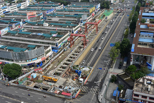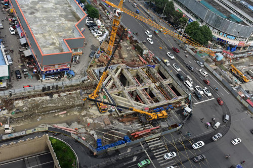 金府站為成都地鐵6號線一、二期工程中間車站,與遠(yuǎn)期規(guī)劃的地鐵27號線節(jié)點換乘,車站位于交大路與金府路交叉路口東南側(cè),小里端橫跨金府路口,沿交大路出城方向輔道呈南北向布置。車站兩端頭均為盾構(gòu)接收井。共設(shè)4個出入口和兩組風(fēng)亭,主體基坑長311.3m,標(biāo)準(zhǔn)段寬20.4m,北端側(cè)擴(kuò)大端寬24.4m,南側(cè)擴(kuò)大端寬24.85m,基坑挖深20.6m至22.65m。主體結(jié)構(gòu)標(biāo)準(zhǔn)段為地下兩層雙跨結(jié)構(gòu),局部為拱形頂板單跨結(jié)構(gòu)(136m)。車站采用敞口、全蓋、半蓋結(jié)合設(shè)計,半蓋挖法施工,其中跨金府路路口為全蓋施工?;訃o(hù)結(jié)構(gòu)采用鉆孔灌注樁+混凝土支撐+鋼支撐支撐體系,主體結(jié)構(gòu)為現(xiàn)澆鋼筋混凝土結(jié)構(gòu)。