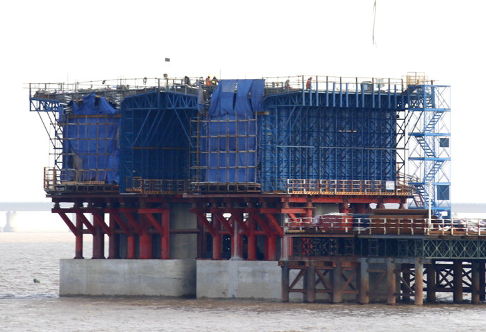 濱海高架橋全長4510米,上部結(jié)構(gòu)設(shè)計為8孔40米、77孔50米預(yù)制架設(shè)箱梁77.5米+135米+77.5米掛籃懸臂34塊現(xiàn)澆連續(xù)梁,海面與梁體凈空高度17.4米。下部采用鉆孔樁、承臺、花瓶墩結(jié)構(gòu),橋梁多次跨越污水管道、原油管道、給水通道、取水盾構(gòu)隧道、通訊光纜等17條管線,緊鄰化工區(qū),管線防破裂、防臺風(fēng)安全風(fēng)險高,施工難度大。在施工中,該項目部采取棧橋打頭陣,樁基和承臺緊隨其后的施工策略,嚴(yán)把每道工序質(zhì)量關(guān),筑牢海下結(jié)構(gòu)基礎(chǔ)。同時采取多種安全防護措施,安全跨越管線,以銅墻鐵壁般的質(zhì)量為連續(xù)梁上部結(jié)構(gòu)施工奠定了基礎(chǔ) 。