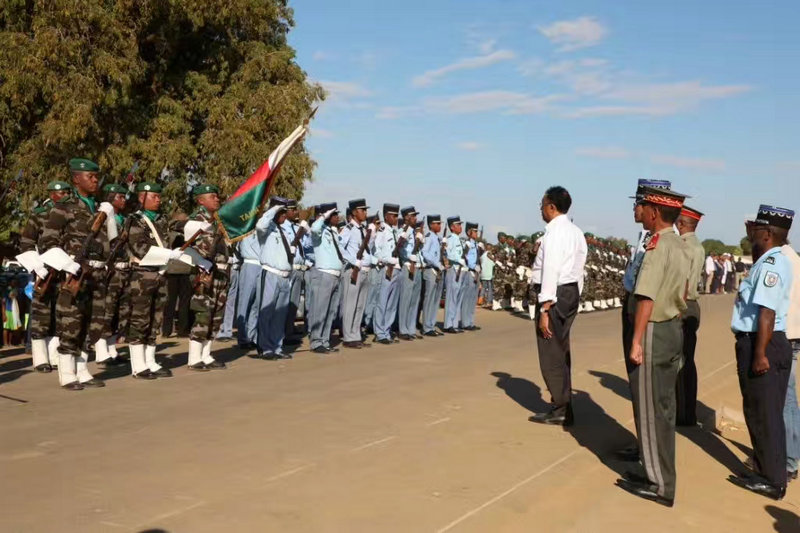 馬達(dá)加斯加總統(tǒng)埃里·拉喬納里馬曼皮亞尼納先生在中鐵十八局集團(tuán)承建的公路上檢閱軍隊(duì)