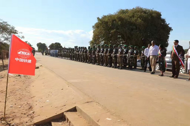 馬達(dá)加斯加三軍儀仗隊(duì)在中鐵十八局集團(tuán)承建的九號公路上列隊(duì)等待總統(tǒng)的檢閱