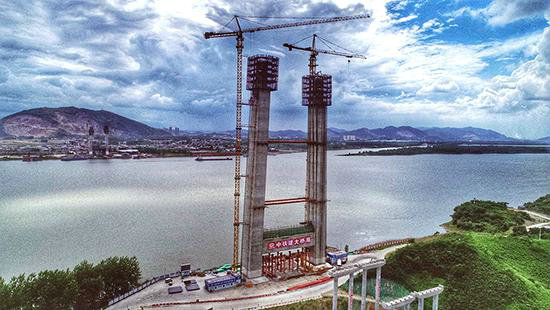 石首長江大橋全長2670米,為主跨820米的雙塔單側(cè)混合梁斜拉橋,主塔塔高232米,位列國內(nèi)斜拉橋前20?;炷亮簢鴥?nèi)首次采用預(yù)制提升滑移膠拼施工方法。項目成功解決了超高主塔快速施工及線形控制問題。大橋主塔已經(jīng)封頂,混凝土箱梁膠拼施工也將完工,大橋進入鋼箱梁吊裝施工階段。