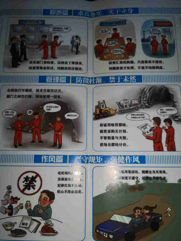 如何更有效地警示和杜絕基層一線項目部工作中的不良作風(fēng)?中鐵十八局隧道公司紀(jì)委以黨史學(xué)習(xí)教育為契機,積極開展“樹信念爭先鋒,守紀(jì)律鑄忠誠”弘揚優(yōu)良傳統(tǒng)和作風(fēng)活動,在對黨員干部集中進行作風(fēng)教育整頓的同時,利用漫畫集的形式,從公司實際出發(fā),把項目部在職責(zé)履行、項目管理、工作過程、廉潔從業(yè)等方面,普遍存在的不擔(dān)當(dāng)不作為、不認(rèn)真不嚴(yán)謹(jǐn)、不規(guī)矩不規(guī)范等24種不良的現(xiàn)實表現(xiàn),比如:“前后部長不交接,臺賬資料亂糟糟。我到任時建新帳,管他舊賬是啥樣。”“考勤打卡不嚴(yán)肅,你提單來我就批。大家都做老好人,管你合規(guī)不合規(guī)。”“特產(chǎn)滿含‘情義’重,你送我送樂融融。發(fā)現(xiàn)問題難開口,怎能指導(dǎo)去督促。”“一點一滴,我之名節(jié)。一厘一毫,國之資產(chǎn)”等等現(xiàn)象,以漫畫的方式制作成小冊子,下發(fā)到全體干部員工手上,這種折疊式的小冊子,方便攜帶,并有漫畫和提示語,生動形象、引人入勝,又便于記憶,深受大家喜愛,也促使大家記憶深刻,從而警示教育黨員干部“不做案中人,不做案中事”,自覺講規(guī)矩守紀(jì)律,廉潔從業(yè),擔(dān)當(dāng)作為,切實起到帶頭表率作用。