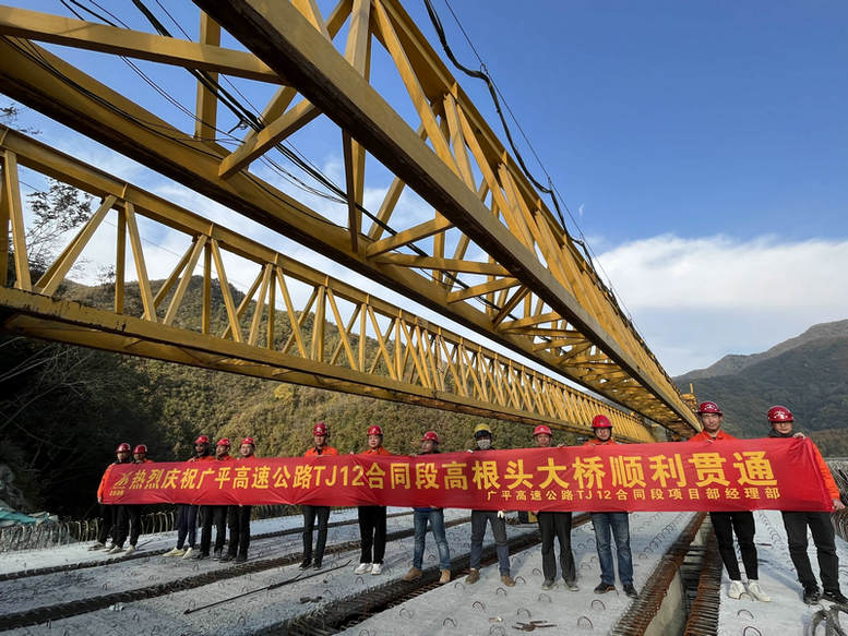 11月15日15時,伴隨著最后一片T梁順利安裝到位,北新路橋集團(tuán)長沙分公司廣平高速公路TJ12合同段項目部控制性工程高根頭大橋順利貫通。