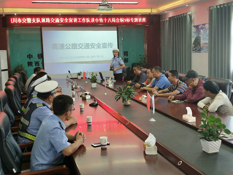 會議現(xiàn)場 2018年9月6日項目部邀請銅川市交警支隊宣講工作隊開展了道路交通安全講座,進一步提高項目部司機文明交通安全出行意識,預(yù)防和減少交通事故的發(fā)生,達(dá)成道路施工安全和交通管理雙保障。
