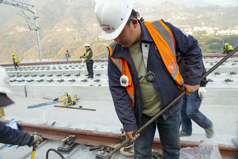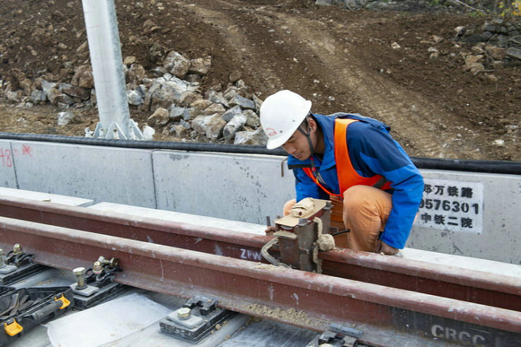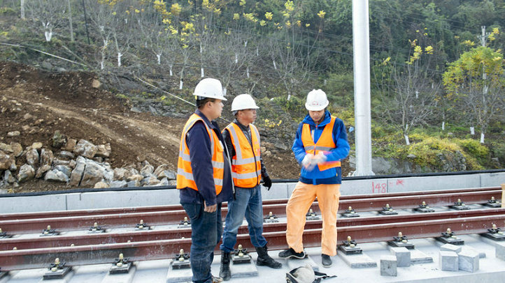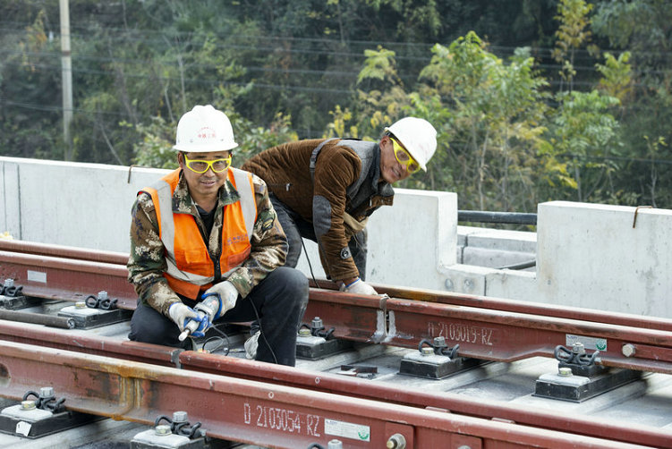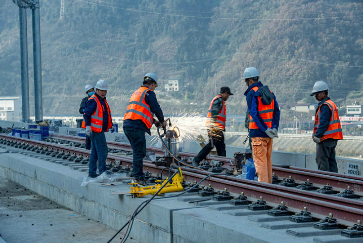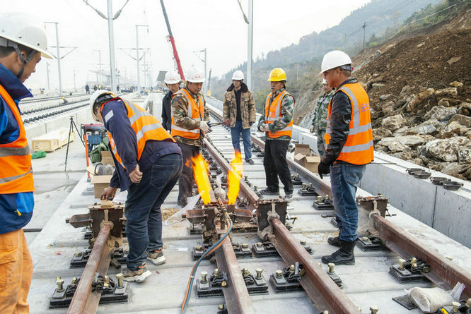 鄭萬高鐵鐵路鋼軌無縫焊接施工正在有序推進-興山車站鋁熱焊施工人員作業(yè)中