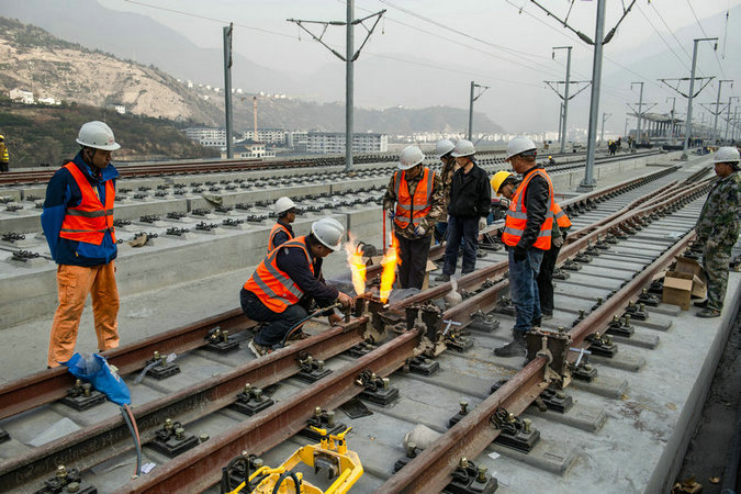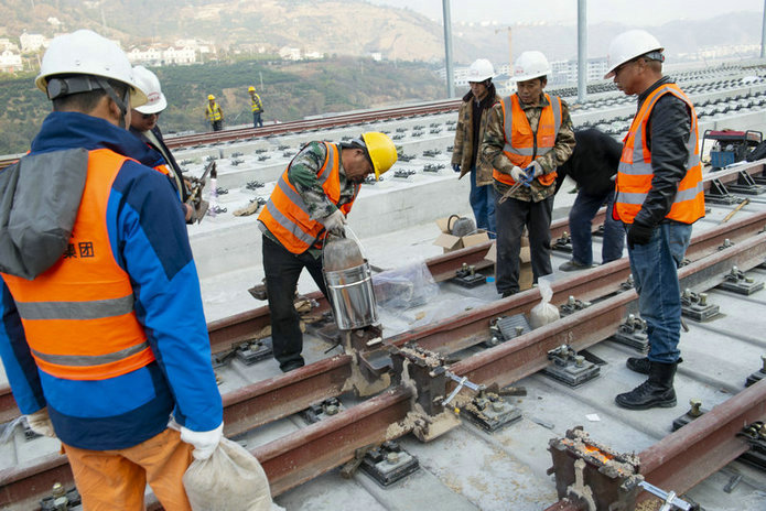 鄭萬高鐵鐵路鋼軌無縫焊接施工正在有序推進-興山車站鋁熱焊施工人員作業(yè)中 鋁熱焊一般應用于鐵路鋼軌的現(xiàn)場焊接,具有設(shè)備簡單、使用方便、不需要電源等特點,是線路鋪設(shè)特別是無縫線路鎖定和鋼軌斷軌修復的不可缺少的方法。鋼軌的鋁熱焊是利用焊劑中的鋁在高溫條件下與氧有較強的化學親合力,它從重金屬還原,同時放出熱量,將金屬熔成鐵水,澆鑄施焊而成。