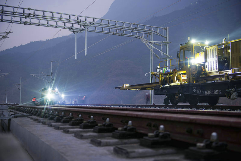 中鐵三局鋪軌施工車進(jìn)入興山站