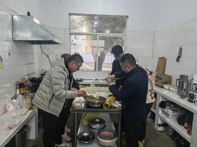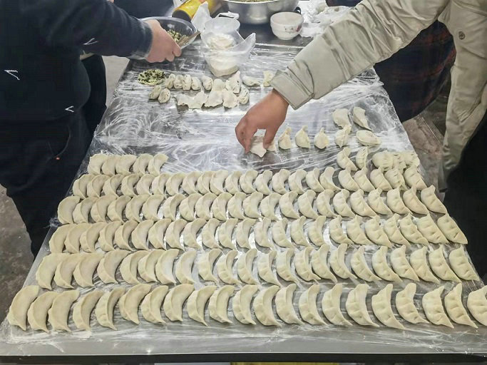 下午5點(diǎn),項(xiàng)目部職工食堂內(nèi)人頭攢動(dòng)、暖意融融,當(dāng)做飯的阿姨拿出早就準(zhǔn)備好的餃子皮,以及韭菜、白菜、雞蛋和豬肉等各類(lèi)原料后,職工們便熱情洋溢地參與其中。大家三三兩兩一組,分工協(xié)作,有的剁餃子餡,有的包餃子,也有的做起了學(xué)徒,虛心的向身邊“餃子高手”請(qǐng)教,研習(xí)制作技巧,忙得不亦樂(lè)乎。經(jīng)過(guò)近2個(gè)小時(shí)的連續(xù)“奮戰(zhàn)”,操作臺(tái)上的餃子一字排開(kāi),花樣繁多、式樣各異,展示出項(xiàng)目部職工齊心協(xié)力的勞動(dòng)成果。
