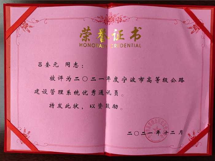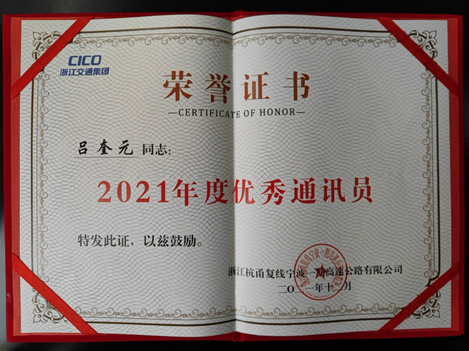 寧波市高等級公路建設(shè)管理中心在全市高速公路建設(shè)領(lǐng)域開展評選2021年度優(yōu)秀通訊員活動,此次共評選出21名優(yōu)秀通訊員,呂奎元是杭甬復(fù)線一期5個(gè)標(biāo)段唯一獲獎的個(gè)人。由業(yè)主組織評選的杭甬復(fù)線2021年度信息宣傳工作先進(jìn)集體和優(yōu)秀通訊員,共有3個(gè)集體和10名個(gè)人獲獎。他熱愛新聞宣傳工作,采寫新聞的過程中,將多年積累的知識、情感、經(jīng)驗(yàn)全部釋放出來。他經(jīng)常深入施工現(xiàn)場拍照、與施工人員交流,采寫出許多有深度、含金量高的新聞,2021年在浙江日報(bào)、寧波日報(bào)、股份公司網(wǎng)站等多家媒體發(fā)表消息、通訊1100余篇。