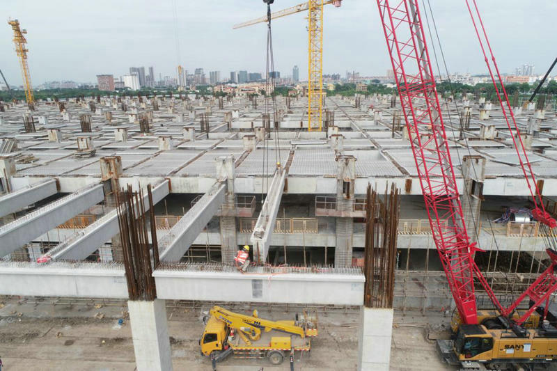 該項(xiàng)目采用最新的裝配式建筑技術(shù),工程涉及6.43萬(wàn)平方米的裝配式蓋板施工,具有吊裝跨度大、重量高、需同步預(yù)留上部開發(fā)條件、梁柱節(jié)點(diǎn)復(fù)雜、安裝定位精度高、接口多等技術(shù)和和質(zhì)量控制難點(diǎn)。