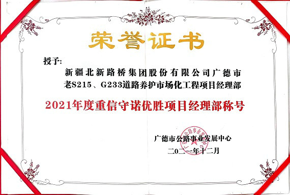 近日,北新路橋集團長三角分公司廣德市道路養(yǎng)護市場化工程項目經(jīng)理部因為出色的工作業(yè)績,被廣德市公路事業(yè)發(fā)展中心授予2021年度重信守諾優(yōu)勝項目經(jīng)理部稱號。
