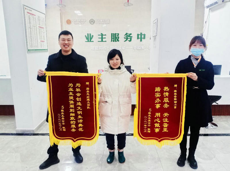 2022年1月6日下午,北新投資公司所屬北新宜邦物業(yè)公司北新御龍灣小區(qū)六街區(qū)業(yè)主吳女士親手把印有“為社會創(chuàng)造文明生活典范 為業(yè)主提供周到細致的服務(wù)”、“熱情服務(wù) 關(guān)懷備至 踏實辦事 用心做事”兩面錦旗送至北新宜邦物業(yè)御龍灣三部項目物業(yè)大廳,對御龍灣三部項目負責(zé)人蔣英志、客服管家謝小雪及整個物業(yè)團隊用心做事、盡心盡力的服務(wù)態(tài)度表達謝意。