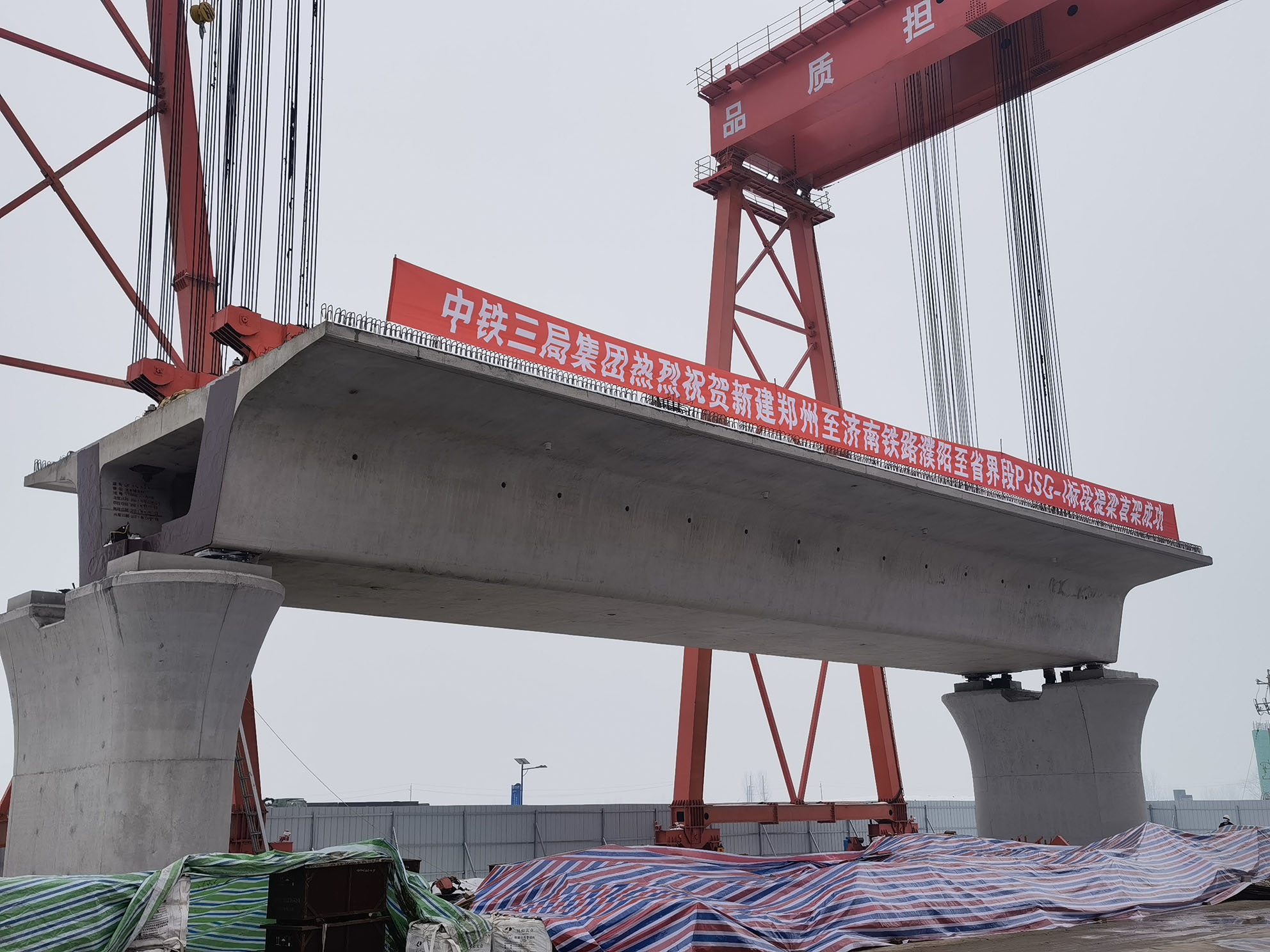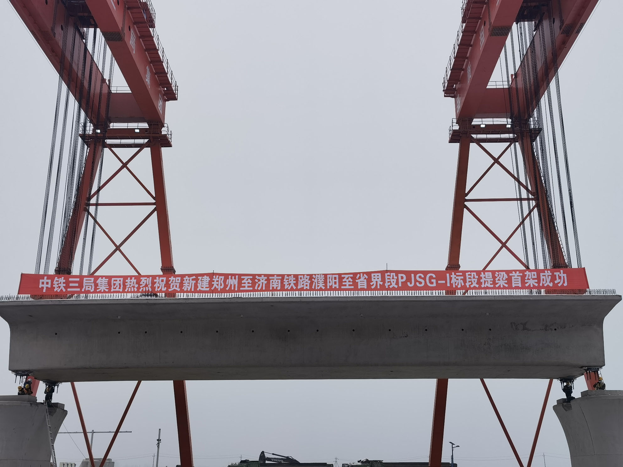 1月24日上午9點18分,隨著2臺DGM450提梁機把一榀32米箱梁穩(wěn)穩(wěn)的落在175#—174#墩上,標志著濟鄭鐵路濮陽至省界段施工開始由線下工程轉(zhuǎn)入線下、線上工程同時進行,鄭濟高鐵建設進入全面提速階段。