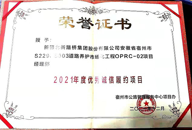 近日,北新路橋集團長三角分公司宿州市道路養(yǎng)護市場化工程項目獲得由宿州市公路管理服務(wù)中心項目辦授予的2021年度優(yōu)秀誠信履約項目榮譽稱號。
