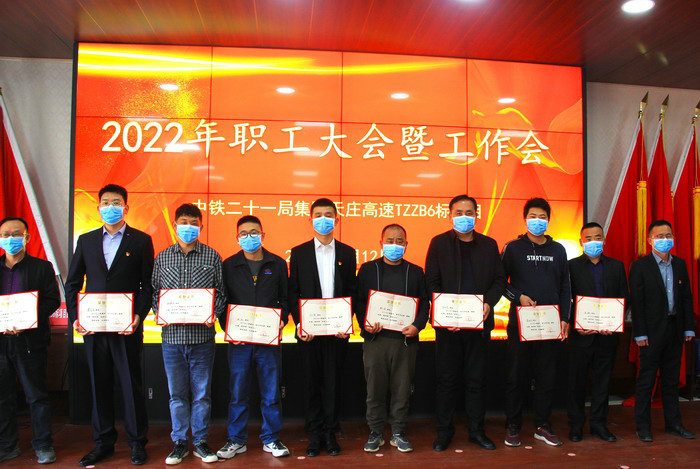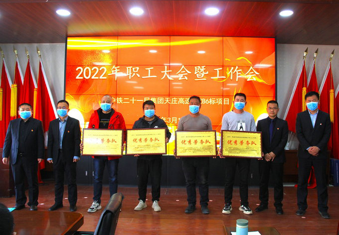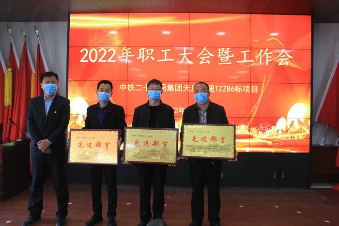 圖為“先進部室”領(lǐng)獎天莊項目2022年職工大會暨工作會在慷慨激昂的《鐵道兵志在四方》歌曲聲中圓滿落幕。