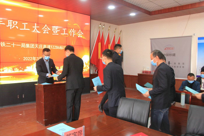 “六管人員”遞交廉潔從業(yè)承諾書 項目總工趙強在會上宣讀了公司《關(guān)于召開基層職工大會的批復(fù)》;項目經(jīng)理柳吉煥做了題為《科學管理 精心施工 再創(chuàng)佳績 全面實現(xiàn)天莊項目完美收官》的2022年職工大會暨工作會報告,報告對項目2021年的工作進行了細致而全面的分析總結(jié),同時對2022年的工作進行了總體安排部署,還傳達了公司執(zhí)行董事、黨委書記莊乾理,公司黨委副書記、總經(jīng)理王小慶的“四會”工作報告;項目副書記錢海做了《天莊項目集體合同保證書執(zhí)行情況匯報》,傳達了公司紀委書記孫成德的紀委工作報告;項目副經(jīng)理畢鈺宣讀了《關(guān)于表彰2021年度先進單位和個人的決定》。
