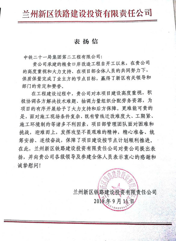 9月11日,中鐵二十一局集團(tuán)二公司蘭州新區(qū)北站物流園糧食口岸項(xiàng)目部收到蘭州新區(qū)鐵路建設(shè)投資有限責(zé)任公司的表?yè)P(yáng)信。對(duì)項(xiàng)目部自開(kāi)工建設(shè)以來(lái)深度參與新區(qū)“一帶一路”的建設(shè)規(guī)劃,保證項(xiàng)目按照既定節(jié)點(diǎn)目標(biāo)順利實(shí)現(xiàn)作出的努力表示感謝。