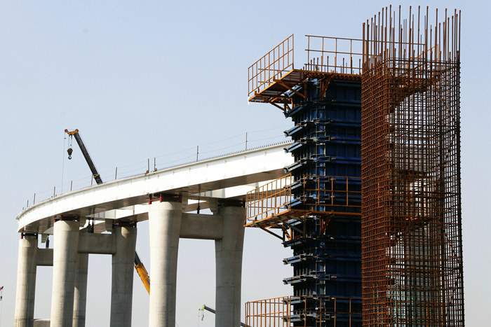 濱?;ネㄊ莵喼拮畲蟮暮I匣ネǎ苍O(shè)8座匝道橋,分內(nèi)環(huán)和外環(huán),其中3座上跨、4座下穿金塘大橋,直徑1.8米—2.5米的樁基1027根,平均長度83米。C匝道為外環(huán),樁基34根、F匝道設(shè)在內(nèi)環(huán),樁基83根,一部分走向并行,在匝道橋中相互作用。去年隆冬先后開工的C、F匝道樁基,地處淺海水域,地質(zhì)結(jié)構(gòu)復雜,在插打鋼護筒、泥漿反循環(huán)鉆孔過程中遭遇堅硬的泥巖和砂巖,進度受阻,該項目部采取由50多噸的液壓振動錘變?yōu)?20噸的液壓振動錘,以超強振動力,強行將鋼護筒振插到83米深處,為鉆孔創(chuàng)造條件。在泥漿反循環(huán)鉆孔作業(yè)中,與泥巖和砂巖相遇,鉆孔十分困難,采取勤換鉆頭、將鉆頭“牙齒”打磨鋒利等多種辦法攻克了鉆孔難題。