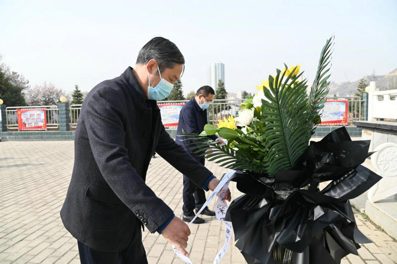 春日的烈士陵園內(nèi),翠柏青青,蒼松肅立,氣氛莊嚴(yán)肅穆,革命烈士紀(jì)念碑巍然屹立,“革命烈士永垂不朽”八個(gè)鎏金大字格外醒目。在公祭革命烈士紀(jì)念碑儀式中,全體人員列隊(duì)行注目禮,奏唱國歌后,全場(chǎng)肅立,向革命烈士紀(jì)念碑三鞠躬。伴著莊嚴(yán)肅穆的獻(xiàn)花曲,柳倉太、祁濤緩步上前,仔細(xì)整理花籃緞帶,并將花籃敬獻(xiàn)于紀(jì)念碑基座前。隨后,大家依次繞行,瞻仰革命烈士紀(jì)念碑和烈士英名紀(jì)念墻,全體人員紛紛敬獻(xiàn)鮮花。