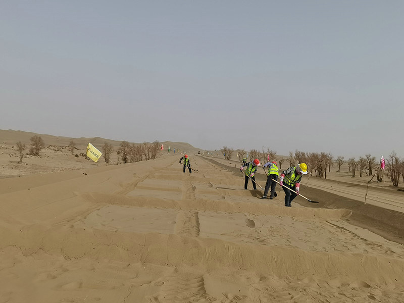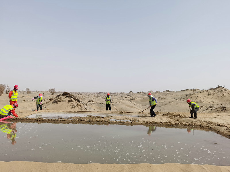 盡管施工現(xiàn)場(chǎng)風(fēng)沙呼嘯,但是依然不能阻擋建工人內(nèi)心的激情澎湃,在路基填筑現(xiàn)場(chǎng)一片“大干”的景象,“打井灌水要滲透2-3米深”,“機(jī)械設(shè)備準(zhǔn)備完畢”,“原地面處理完成”,各項(xiàng)工作有序推進(jìn),路基試驗(yàn)段的順利開(kāi)工鼓舞了身處惡劣環(huán)境中施工人員的士氣,同時(shí)為風(fēng)積沙路基填筑的全面施工打下了堅(jiān)實(shí)的基礎(chǔ)。