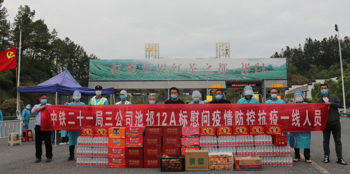 本網(wǎng)安徽黃山4月15日訊(王克亮 陳瀟飛 尹登明)4月14日下午,中鐵二十一局三公司池祁高速12A標(biāo)項(xiàng)目部為感謝堅(jiān)守一線抗疫人員做出的貢獻(xiàn),項(xiàng)目經(jīng)理張一平、副經(jīng)理李惠惠代表項(xiàng)目全體參建員工,帶上礦泉水、方便面,水果、飲料等慰問(wèn)品向奮戰(zhàn)在抗疫一線人員表示誠(chéng)摯的慰問(wèn)!向抗疫人員表達(dá)真誠(chéng)問(wèn)候與崇高敬意,感謝他們的為疫情防控付出的辛勞和勇?lián)姑母呱衅焚|(zhì)。