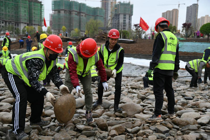 活動中,指揮部成立黨員突擊隊,黨員干部沖在前線,臨夏工程公司及各項目班子成員率先垂范,邊示范、邊指導(dǎo),走進職工和勞務(wù)人員的隊伍當中,與他們一起參與湖底卵石鋪筑,充分發(fā)揮了黨員模范先鋒作用。從清晨一場突如其來的雨夾雪到正午的烈日暖陽再到傍晚的涼風習習,全體干部職工在黨組織的帶領(lǐng)下,不怕苦、不怕累,你拉我一把、我扶他一下,團結(jié)協(xié)作,圓滿完成義務(wù)勞動。