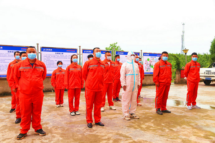 近日,在該項目駐地,由15名職工組成的疫情上報組、通訊聯(lián)絡組、現(xiàn)場急救組、防疫安保組、消殺工作組、物資保障組六個應急小組列成方陣。