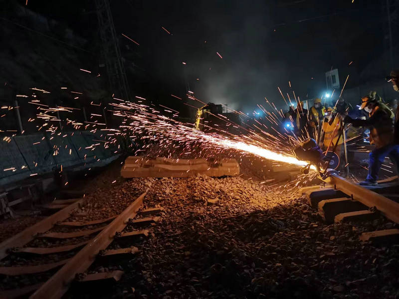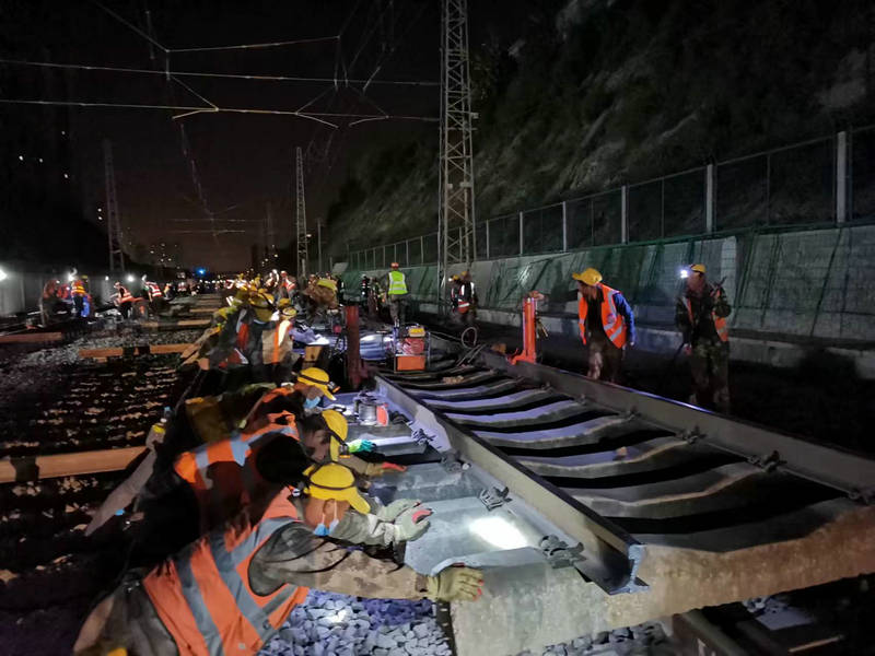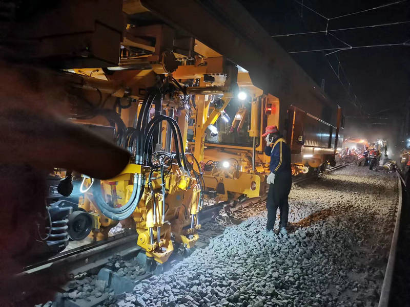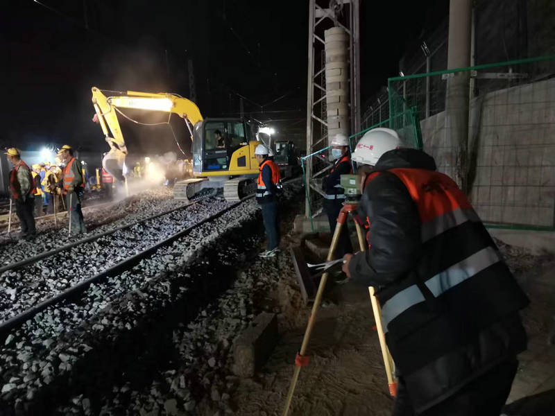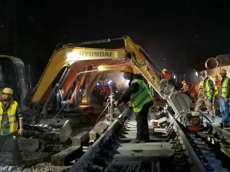 施工前安全負(fù)責(zé)人對參與既有線施工人員進(jìn)行了班前教育,對各類工機(jī)具進(jìn)行了清點(diǎn)登記。0點(diǎn)05分,車站調(diào)度施工命令下達(dá)后,由施工總指揮下達(dá)進(jìn)網(wǎng)施工指示,現(xiàn)場施工人員嚴(yán)格按照方案及交底有序開展施工,拆除防護(hù)柵欄300米,掛設(shè)回流線、切斷既有線路81.5米鋼軌滑出軌排、新預(yù)鋪的155#道岔縱向移動30米,道岔橫移落位、上渣整道、大機(jī)搗固、工電聯(lián)調(diào)等工序有條不紊地開展。每道工序精準(zhǔn)銜接、快速有序、準(zhǔn)確無誤。經(jīng)過250分鐘奮戰(zhàn),在參戰(zhàn)人員的集體努力下,順利完成了施工任務(wù)。