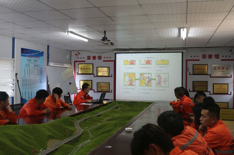 “火災(zāi)逃生的時(shí)候,要用濕毛巾捂住自己的口鼻,彎著腰跑,以免火災(zāi)產(chǎn)生的煙塵堵住呼吸道……”,“滅火器使用前,要先上下顛倒搖動(dòng),然后拔掉保險(xiǎn)銷,將噴嘴對(duì)準(zhǔn)火焰最根部,再用力壓下壓把”。項(xiàng)目安全部長陳潔正在為大家講解消防安全知識(shí)。