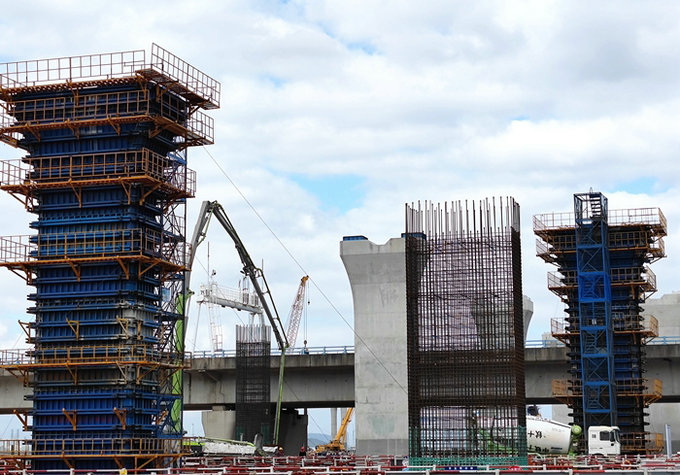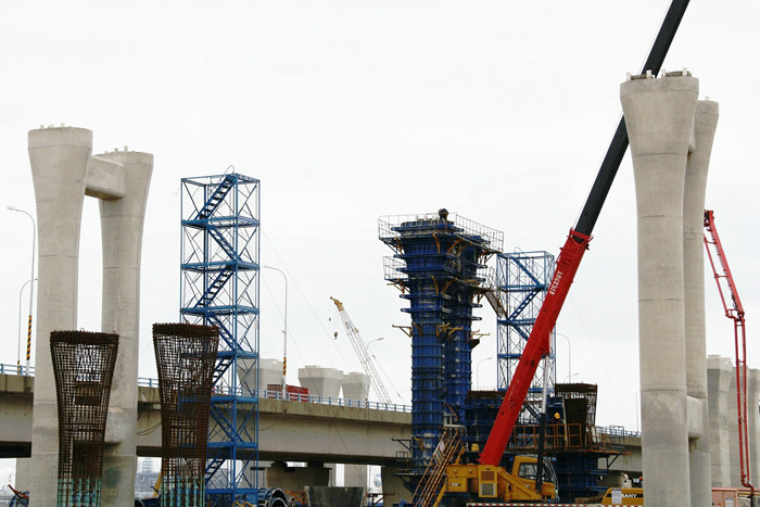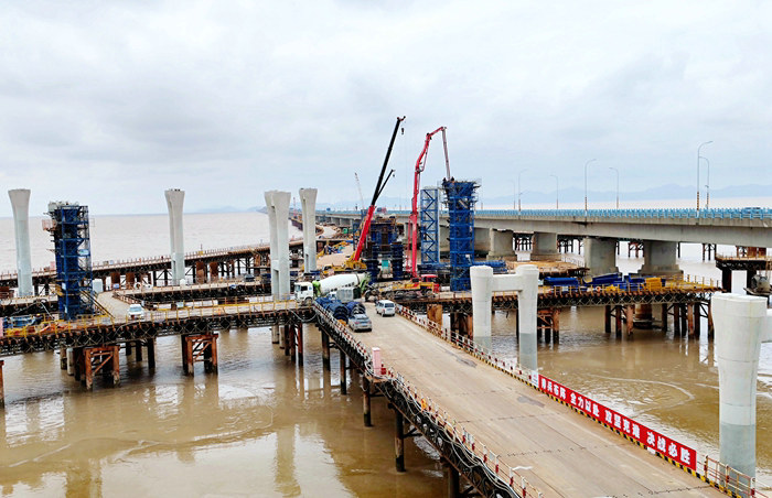 因此,像往常一樣,杭甬項目濱海互通立交工地,在技術(shù)人員的指導(dǎo)下,只見履帶吊操縱振動力重達200噸的防音型振動錘,緊緊咬住鋼護筒,不住地發(fā)出“嗡嗡”的聲響,有節(jié)奏地一寸一寸地插向海底。在主線橋和A匝道橋,混凝土罐車的罐子不停地旋轉(zhuǎn),由地泵將一方方混凝土源源不斷地輸送到20多米高的橋墩模具內(nèi),一個小時內(nèi)將20多立方混凝土澆注完畢,等候在棧橋上的另一臺混凝土罐車繼續(xù)同樣的步驟,8小時后,一座橋墩順利完工,這樣的場景每天都在重復(fù)著。在鋼棧橋上,運送橋墩鋼筋籠、鋼護筒、承臺鋼模的大型貨車你來我往、穿織如梭。作業(yè)工人在橋墩上安裝鋼模的動作十分老練,三下兩下就將一個螺帽檸在螺桿上。在大臨鋼筋加工場,工人們啟動按鈕,將一根根粗壯的螺紋鋼自動輸送到車床上,機器快速地旋轉(zhuǎn),伴隨著低沉的嗡嗡聲,不消兩分鐘,鋼筋的一頭便出現(xiàn)約8厘米長的螺紋,一捆螺紋鋼筋一頭加工完畢,接著加工另一頭,有條不紊、精工細作,一次達到合格。在大棚的幾個鋼筋籠加工處,采用的是制動化作業(yè)流水線,技術(shù)工人將一個個成型的鋼筋圓圈與12米長的螺紋鋼筋焊接固定后,構(gòu)成一個雛形、簡約的鋼筋籠,然后將一盤小拇指粗的圓鋼筋一圈圈纏繞在鋼筋籠上,機器帶動著鋼筋籠旋轉(zhuǎn),電焊工麻利地在縱橫交叉點上焊接,焊花飛濺,將焊工全身映得通紅。以此推進,焊工重復(fù)著同樣的動作,直到將一個12米長的漂亮的鋼筋籠制作完成。制作一個鋼筋籠大約5個小時。