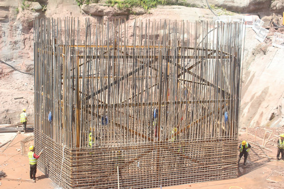 工人們在綁扎廖家溪軌道專用橋西岸墩柱鋼筋