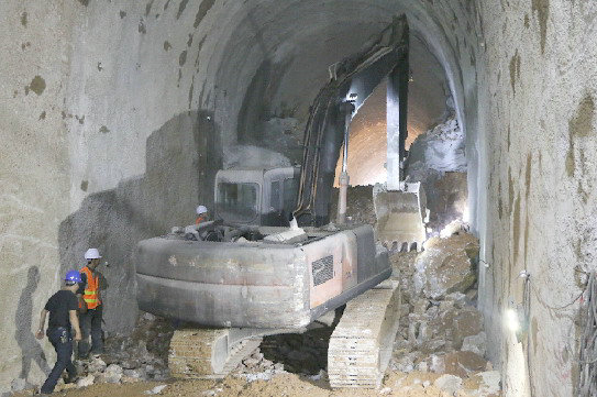 文筆山一號隧道貫通后,職工們進(jìn)行棄渣清理