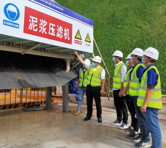 曹元均(左1)與技術人員探討泥漿壓濾機原理