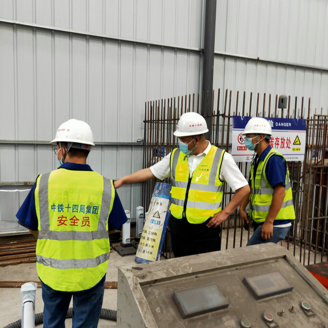 曹元均(右2)在鋼筋加工車間檢查安全