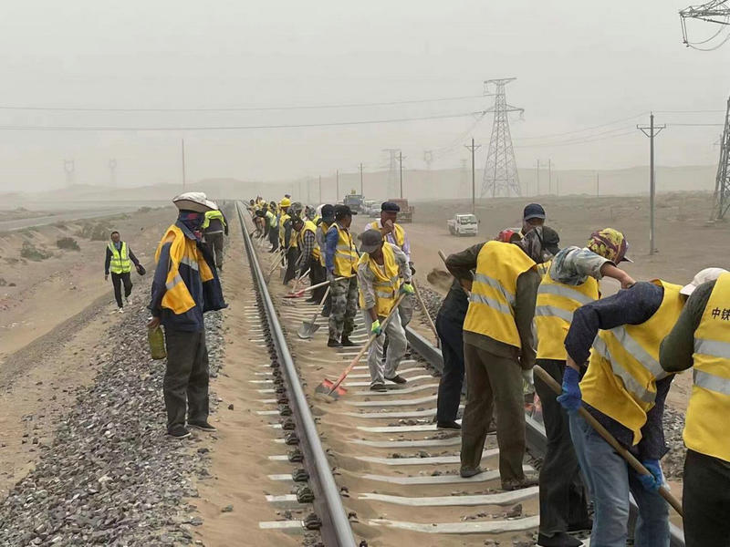 5月25日中午時分,一場沙塵暴“空降”新疆奇臺縣及吉木薩爾縣等境內(nèi),最高風力可達十級,并攜帶著大量沙塵,沿線鐵路線被沙塵掩埋。得知此情況后,中鐵二十一局烏將鐵路項目經(jīng)理立即下達搶險命令,第三作業(yè)隊接到任務(wù)后,立即組織60余人迎著風沙徒步趕往現(xiàn)場,配合烏魯木齊工務(wù)段進行道路搶險任務(wù)。