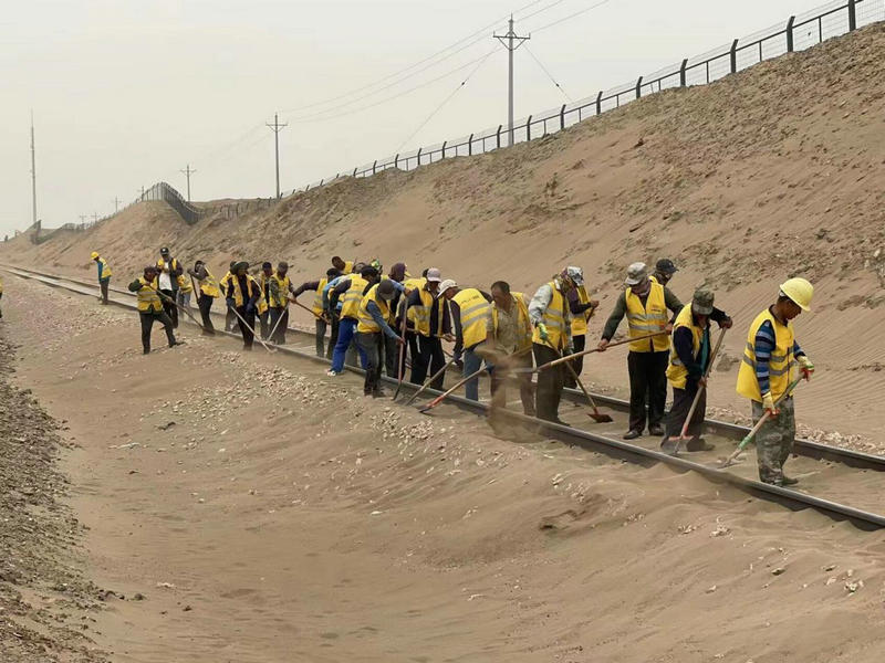 搶險隊伍聽從指揮,一字排開,用最快的節(jié)奏揮舞著鐵鍬,一鍬一鍬地將沙子揚到線路2米以外,展開緊張有序的搶險施工作業(yè)。有的路基高達5米,搶險隊伍被風吹的東倒西歪,揚沙被大風吹散,線路上瞬間沙塵漫天,沙浪一波接著一波地襲來,砂粒打在人臉上生疼。盡管嘴里、頭發(fā)里都是沙子,但大家揮舞鐵鍬的動作從未間斷。