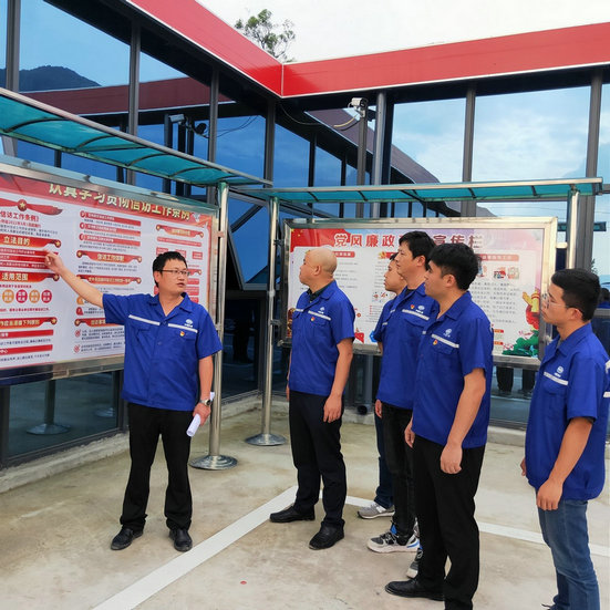 項(xiàng)目部書記何偉帶領(lǐng)黨員干部學(xué)習(xí)上墻上欄的黨風(fēng)廉政建設(shè)重要教育內(nèi)容