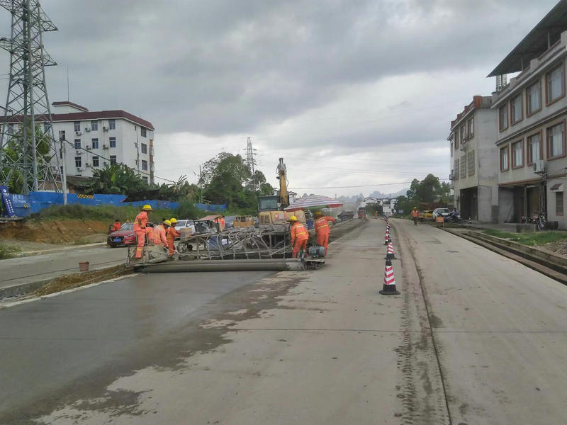 賀州訊(通訊員 朱寶亮)端午節(jié)前,賀州至富川公路二期(賀街至蓮塘段)項目施工現(xiàn)場一片繁忙,水穩(wěn)攤鋪機、壓路機、混凝土三輥軸攤鋪機、挖掘機、抹光機、運輸車等機械設備在路段穿梭不停,由于正值雨季,項目一線施工人員搶抓晴好天氣,正忙著水穩(wěn)攤鋪、混凝土路面施工,決戰(zhàn)120天,為9月底主體通車任務奠定基礎。
