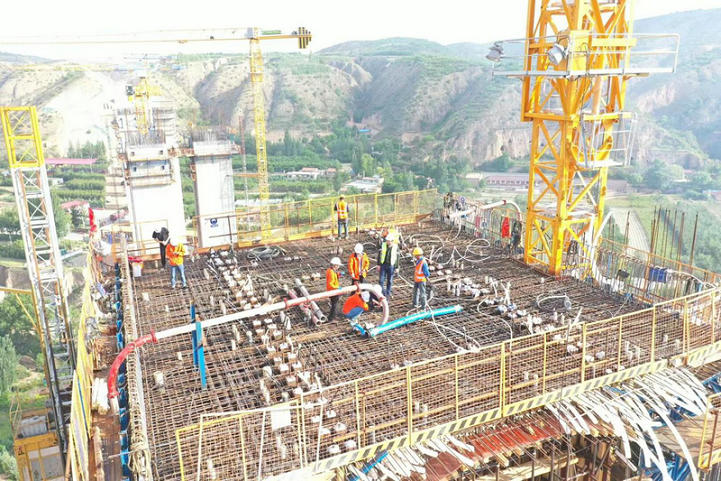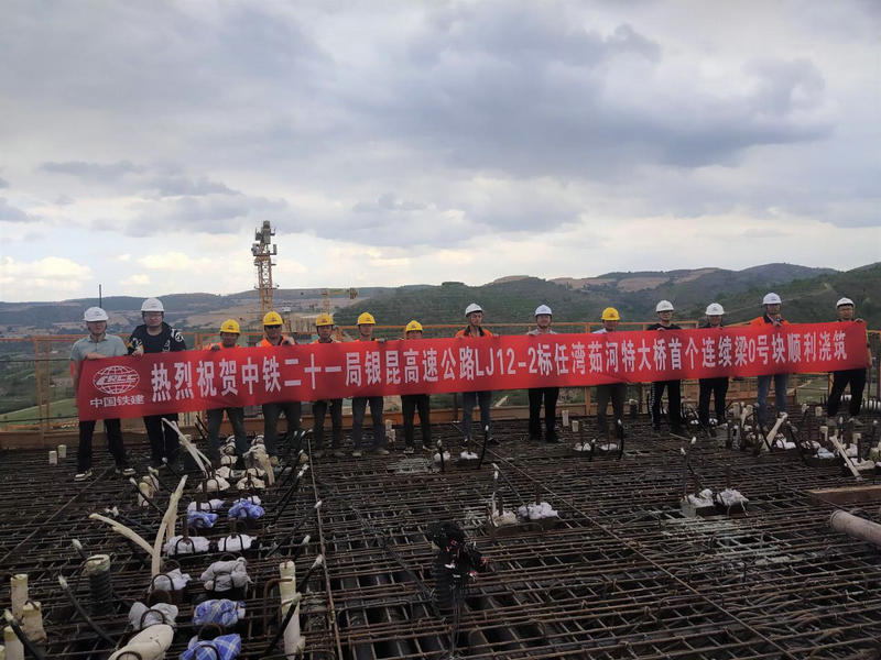 6月2日7點(diǎn)58分,在鞭炮聲和機(jī)械的轟鳴聲中,第一輛混凝土運(yùn)輸車緩緩開進(jìn)現(xiàn)場,開啟的地泵源源不斷將混凝土輸送到高處的任灣茹河特大橋右幅11#主墩0號(hào)塊,標(biāo)志著中鐵二十一局銀昆高速公路LJ12-2標(biāo)任灣茹河特大橋首個(gè)0號(hào)塊混凝土開始澆筑,橋梁上部結(jié)構(gòu)施工正式拉開帷幕。