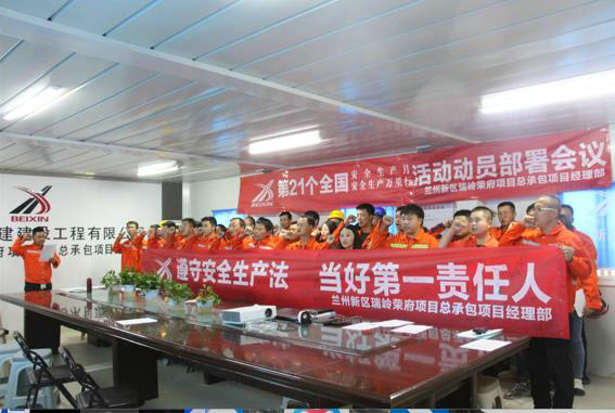 生命與生產(chǎn)同行,安全與安心相伴。為筑牢安全生產(chǎn)防線(xiàn),強(qiáng)化底線(xiàn)思維和紅線(xiàn)意識(shí),5月31日,蘭州新區(qū)項(xiàng)目部舉行了以“遵守安全生產(chǎn)法,當(dāng)好第一責(zé)任人”為主題的安全生產(chǎn)月活動(dòng)啟動(dòng)儀式,項(xiàng)目全體職工及勞務(wù)班組參加。